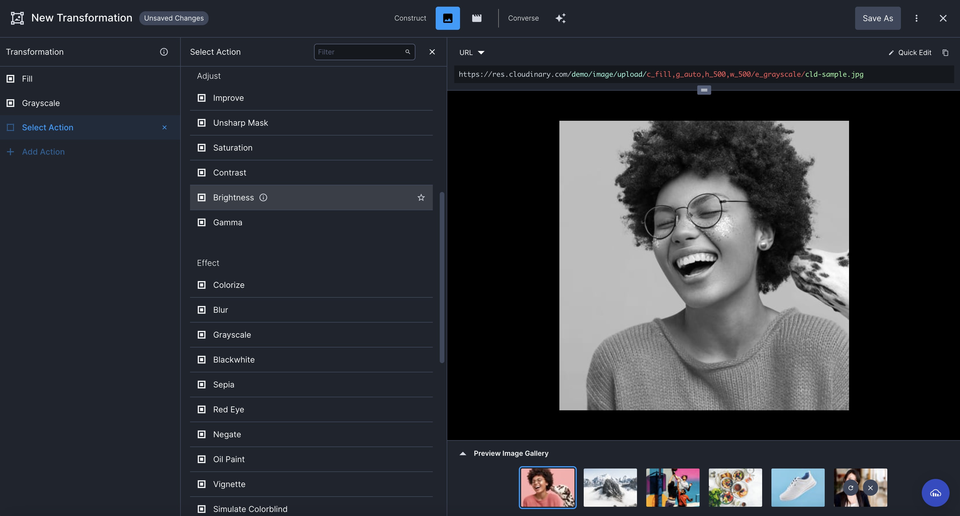 Cloudinary allows you to easily transform your images on the fly to any required format, style and dimension, and apply effects and other visual enhancements. You can also optimize your images to deliver them with minimal file size alongside high visual quality for an improved user experience and minimal bandwidth. You can do all of this by implementing dynamic image transformation and delivery URLs. Your transformed images are then delivered to your users through a fast CDN with optimized caching.